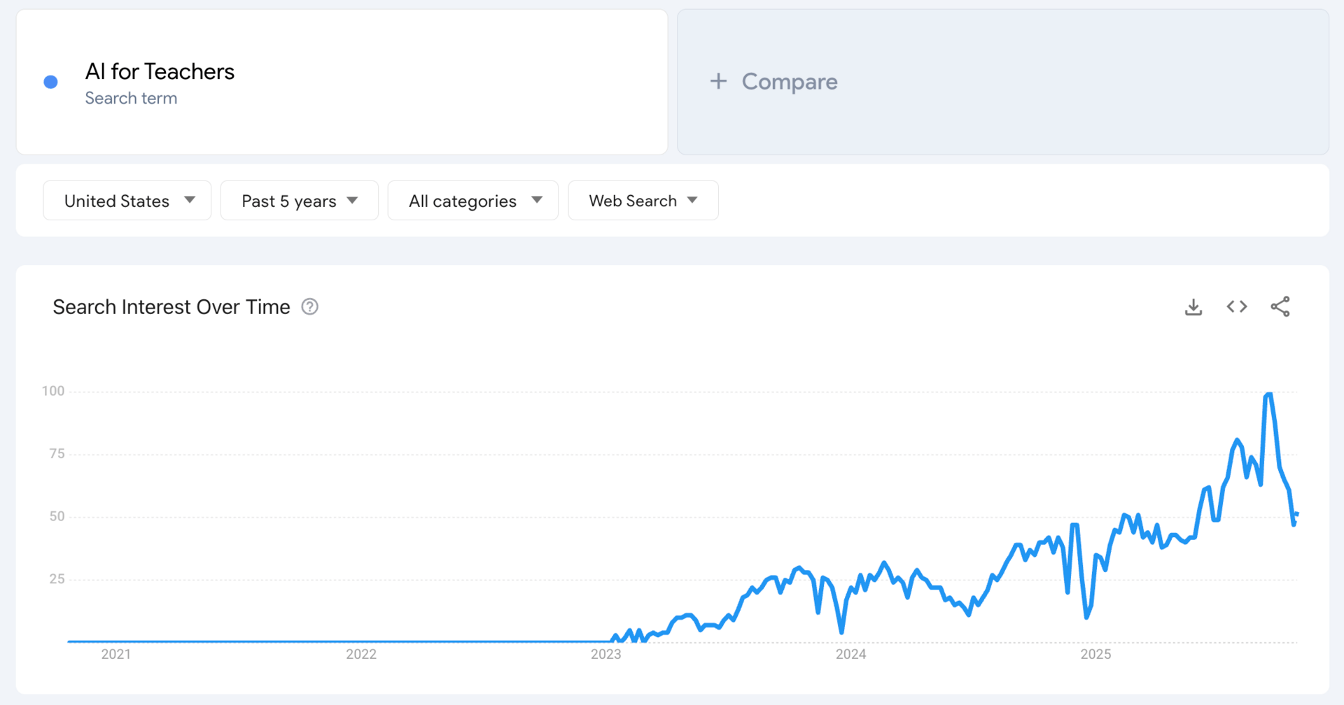According to Google Trends, U.S. searches for “AI for Teachers” have skyrocketed to record highs in 2025 — hitting a peak score of 100, up from near-zero just two years ago.